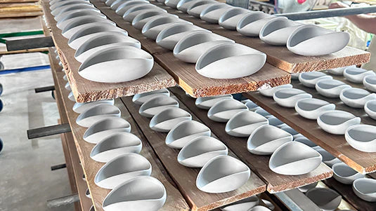 These ceramic products are semi-finished products. We place them on wooden shelves to dry.